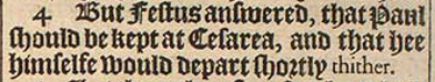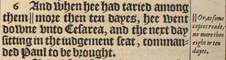 6 And when hee had taried among them || more then ten dayes, hee went downe vnto Cesarea, and the next day sitting in the iudgement seat, commanded Paul to be brought.[||Or, as some copies reade, no more then eight or ten dayes.]