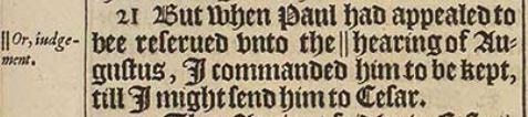 21 But when Paul had appealed to bee reserued vnto the || hearing of Augustus, I commanded him to be kept, till I might send him to Cesar.[||Or, judgement.]
