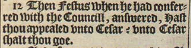 12 Then Festus when he had conferred with the Councill, answered, Hast thou appealed vnto Cesar? vnto Cesar shalt thou goe.