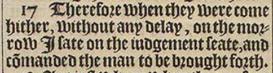 17 Therefore when they were come hither, without any delay, on the morrow I sate on the iudgement seate, and cōmanded the man to be brought forth.