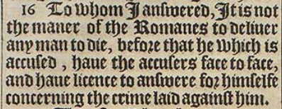16 Worauf ich antwortete 'Es ist nicht die Art der Römer, irgend jemand zum Tode zu verurteilen, bevor derjenige, der beschuldigt wird, die Ankläger von Angesicht zu Angesicht hat und die Erlaubnis hat, für sich selbst auf das Verbrechen zu antworten, das gegen ihn vorgebracht wird.'