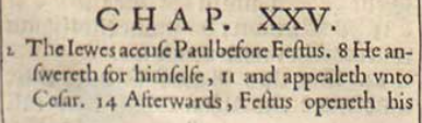 2 Die Juden beschuldigen Paulus vor Festus. 8 Er antwortet für sich selbst, 11 und appelliert an Cäsar. 14 Darnach eröffnet Festus seine Sache dem König Agrippa, 23 und er wird herausgeführt. 25 Festus spricht ihn frei, er habe nichts getan, wert des Todes.