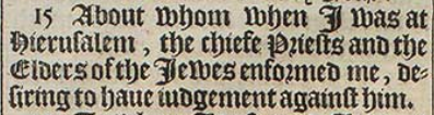15 About whom when I was at Hierusalem, the chiefe Priests and the Elders of the Iewes enformed me, desiring to haue iudgement against him.