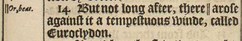 14 But not long after, there || arose against it a tempestuous winde, called Euroclydon.[|| Or, beat.]
