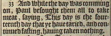 33 And while the day was comming on, Paul besought them all to take meat, saying, This day is the fourteenth day that ye haue taried, and continued fasting, hauing taken nothing.