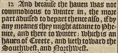 12 And because the hauen was not commodious to winter in, the more part aduised to depart thence also, if by any meanes they might attaine to Phenice, and there to winter; which is an hauen of Creete, and lieth toward the Southwest, and Northwest.