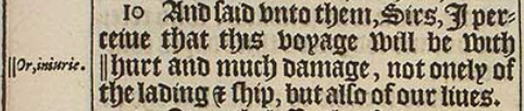 10 And said vnto them, Sirs, I perceiue that this voyage will be with || hurt and much damage, not onely of the lading & ship, but also of our liues.[ || Or, inuirie. ]