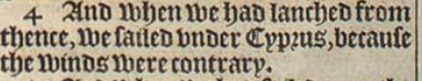 4 And when we had lanched from thence, we sailed vnder Cyprus, because the winds were contrary.