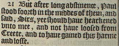 21 But after long abstinence, Paul stood foorth in the middes of them, and said, Sirs, yee should haue hearkened vnto mee, and not haue loosed from Creete, and to haue gained this harme and losse.
