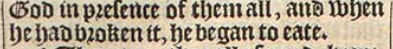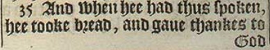 35 And when hee had thus spoken, hee tooke bread, and gaue thankes to God in presence of them all, and when he had broken it, he began to eate.