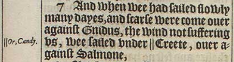 7 And when wee had sailed slowly many dayes, and scarse were come ouer against Gnidus, the wind not suffering vs, wee sailed vnder || Creete, ouer against Salmone, [ || Or, Candy. ]