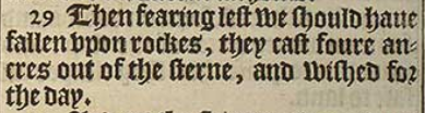 29 Then fearing lest we should haue fallen vpon rockes, they cast foure ancres out of the sterne, and wished for the day.