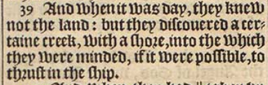 39 And when it was day, they knew not the land: but they discouered a certaine creek, with a shore, into the which they were minded, if it were possible, to thrust in the ship.