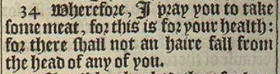34 Wherefore, I pray you to take some meat, for this is for your health: for there shall not an haire fall from the head of any of you.