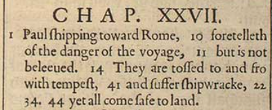 1 Paulus schifft gen Rom ein, 10 prophezeit die Gefahr der Reise, 11 wird aber nicht geglaubt. 14 Sie werden hin und her geworfen vom Sturm, 41 und erleiden Schiffbruch, 22 34. 44 doch alle kommen sicher an Land.