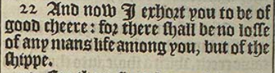 22 And now I exhort you to be of good cheere: for there shall be no losse of any mans life among you, but of the shippe.