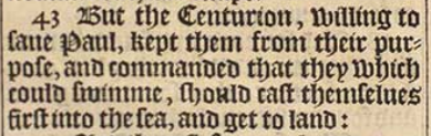 43 But the Centurion, willing to saue Paul, kept them from their purpose, and commanded that they which could swimme, should cast themselues first into the sea, and get to land: