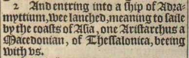 2 And entring into a ship of Adramyttium, wee lanched, meaning to saile by the coasts of Asia, one Aristarchus a Macedonian, of Thessalonica, beeing with vs.