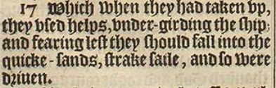 17 Which when they had taken vp, they vsed helps, vnder-girding the ship; and fearing lest they should fall into the quicke-sands, strake saile, and so were driuen.