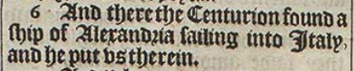 6 And there the Centurion found a ship of Alexandria sailing into Italy, and he put vs therein.