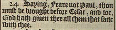 24 Saying, Feare not Paul, thou must be brought before Cesar, and loe, God hath giuen thee all them that saile with thee.