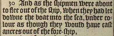 30 And as the shipmen were about to flee out of the ship, when they had let downe the boat into the sea, vnder colour as though they would haue cast ancres out of the fore-ship,