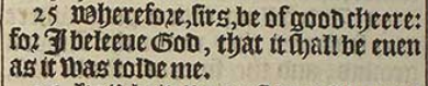 25 Wherefore, sirs, be of good cheere: for I beleeue God, that it shall be euen as it was tolde me.