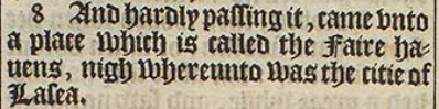 8 And hardly passing it, came vnto a place which is called the Faire hauens, nigh whereunto was the citie of Lasea.