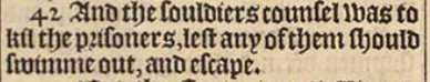 42 And the souldiers counsel was to kil the prisoners, lest any of them should swimme out, and escape.