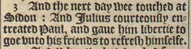 3 And the next day wee touched at Sidon: And Iulius courteously entreated Paul, and gaue him libertie to goe vnto his friends to refresh himselfe.