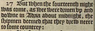 27 But when the fourteenth night was come, as wee were driuen vp and downe in Adria about midnight, the shipmen deemed that they drew neere to some countrey:
