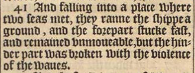 41 And falling into a place where two seas met, they ranne the shippe a ground, and the forepart stucke fast, and remained vnmoueable, but the hinder part was broken with the violence of the waues.