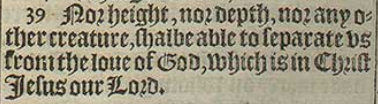 39 Nor height, nor depth, nor any other creature, shalbe able to separate vs from the loue of God, which is in Christ Iesus our Lord.