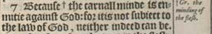7 Because +the carnall minde is enmitie against God: for it is not subiect to the law of God, neither indeed can be.[+Gr. the minding of the flesh.]