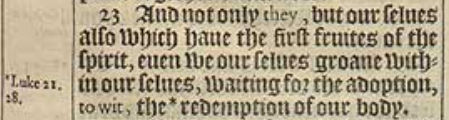 23 And not only they, but our selues also which haue the first fruites of the spirit, euen we our selues groane within our selues, waiting for the adoption, to wit, the *redemption of our body.[*Luke 21. 28.]