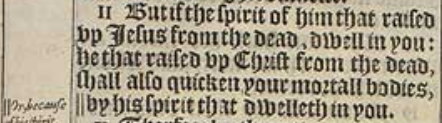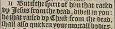 11But if the spirit of him that raised vp Iesus from the dead, dwell in you: he that raised vp Christ from the dead, shall also quicken your mortall bodies, || by his spirit that dwelleth in you.[|| Or, because of his spirit.]