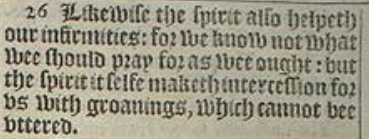 26 Likewise the spirit also helpeth our infirmities: for we know not what wee should pray for as wee ought: but the spirit it selfe maketh intercession for vs with groanings, which cannot bee vttered.