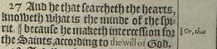 27 And he that searcheth the hearts, knoweth what is the minde of the spirit, || because he maketh intercession for the Saints, according to the will of God.[||Or, that]