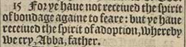 15 For ye haue not receiued the spirit of bondage againe to feare: but ye haue receiued the spirit of adoption, whereby we cry, Abba, father.