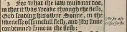 3 For what the law could not doe, in that it was weake through the flesh, God sending his owne Sonne, in the likenesse of sinnefull flesh, and ||for sinne condemned sinne in the flesh:[||Or, by a sacrifice for sin.]