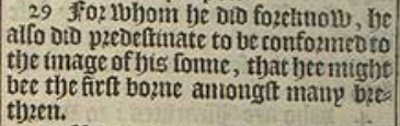 29 For whom he did foreknow, he also did predestinate to be conformed to the image of his sonne, that hee might bee the first borne amongst many brethren.