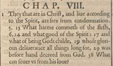 1 They that are in Christ, and liue according to the Spirit, are free from condemnation. 5. 13 What harme commeth of the flesh, 6.14 and what good of the Spirit: 17 and what of being Gods childe, 19 whose glorious deliuerance all things long for, 29 was before hand decreed from God. 38 What can seuer vs from his loue?