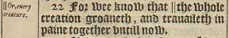 22 For wee know that ||the whole creation groaneth, and trauaileth in paine together vntill now.[||Or, euery creature.]