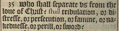 35 Who shall separate vs from the loue of Christ? shall tribulation, or distresse, or persecution, or famine, or nakednesse, or perill, or sword?