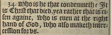 34 Who is he that condemneth? It is Christ that died, yea rather that is risen againe, who is euen at the right hand of God, who also maketh intercession for vs.