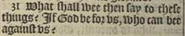 31 What shall wee then say to these things? If God be for vs, who can bee against vs?
