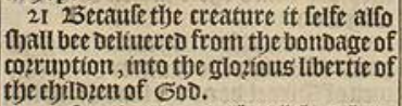 21 Because the creature it selfe also shall bee deliuered from the bondage of corruption, into the glorious libertie of the children of God.