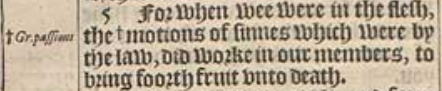 5 For when wee were in the flesh, the +motions of sinnes which were by the law, did worke in our members, to bring foorth fruit vnto death.[+Gr. passions]