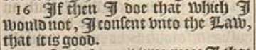 16 If then I doe that which I would not, I consent vnto the Law, that it is good.