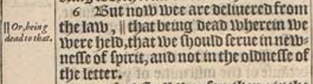 6 But now wee are deliuered from the law, || that being dead wherein we were held, that we should serue in newnesse of spirit, and not in the oldnesse of the letter.[|| Or, being dead to that.]